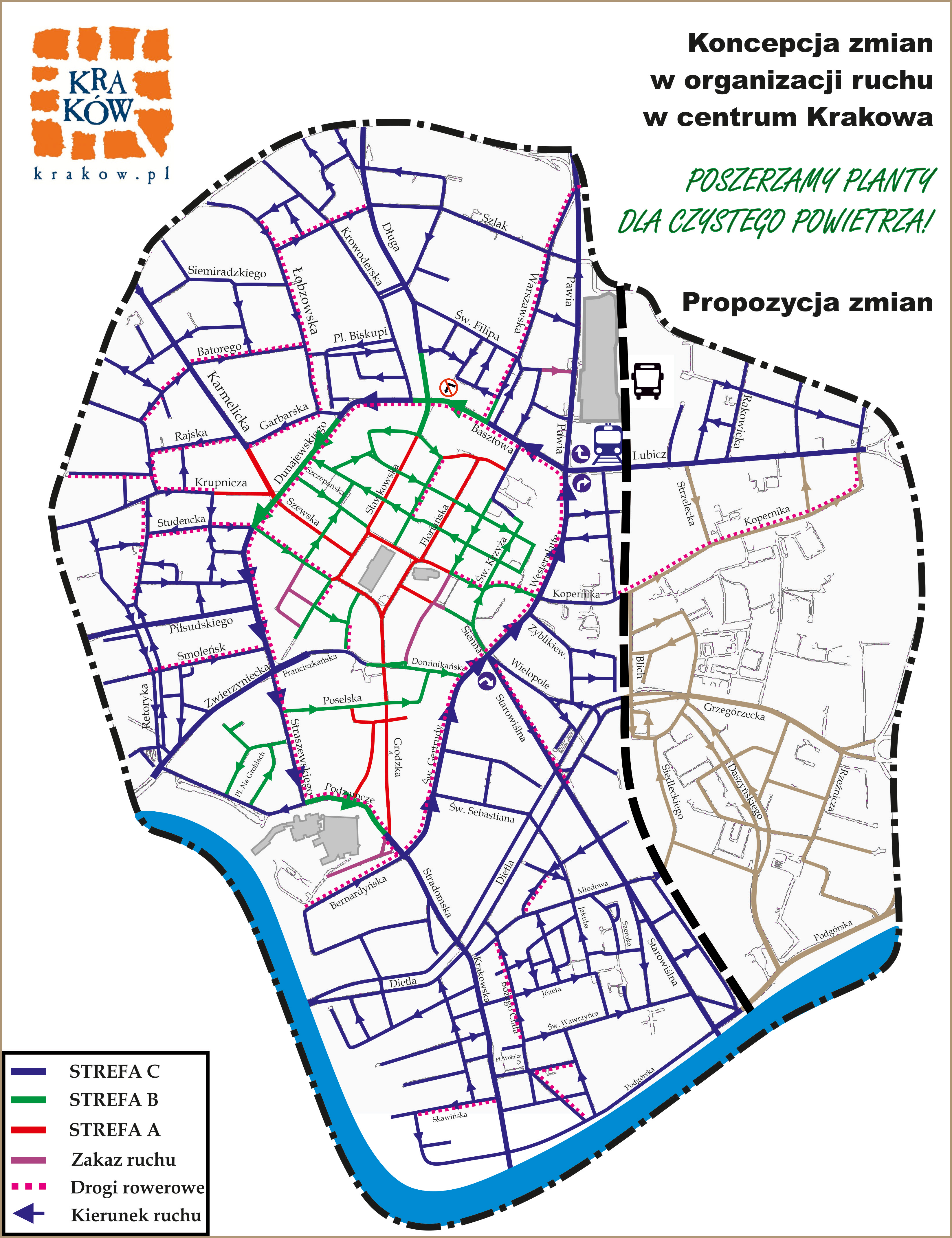 Miasto, wsparte koncepcją ekspertów z zakresu systemów komunikacyjnych,proponuje wprowadzenie ruchu jednokierunkowego wokół Plant w kierunku przeciwnym do wskazówek zegara, wyłącznie skrętów w prawo z ul. Westerplatte w ul. Lubicz i z ul. Lubicz w ul. Pawią w celu eliminacji ruchu tranzytowego, ograniczenie skrętu w lewo z ul. Gertrudy w Sienną i ul. Basztowej w Sławkowską. Zgodnie z propozycjami grupy ekspertów, samochody miałaby jeździć po jedni zewnętrznej pierwszej obwodnicy, a na pasie przy Plantach miałaby powstać trasa rowerowa. Środek, a więc torowisko, byłby zarezerwowany dla komunikacji tramwajowej i autobusowej. „Rozwiązania, które proponujemy dla Śródmieścia Krakowa, stosowane są w wielu europejskich metropoliach. W bliskim naszemu miastu – Wiedniu – od lat działa tzw. I ring. To także nic innego jak powrót do wcześniejszych już koncepcji prof. Andrzeja Rudnickiego z Politechniki Krakowskiej" – wyjaśnia dr inż. Tomasz Kulpa, jeden z autorów pozycji zmian.