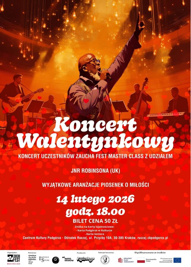 „Koncert Walentynkowy”, wieńczący Zaucha Fest Masterclass odbędzie się w sobotę, 14 lutego o godz. 18.00 w Centrum Kultury Podgórze – Ośrodek Ruczaj przy ulicy Przyzby 10A. Na scenie obok uczestników wystąpi również JNR Robinson, który w niedzielę ma zaplanowane kolejne dwa koncerty w Krakowie z Mateusz Pałka Trio w klubie Mercy Brown. Brytyjczyk znany jest z tego, że potrafi zaczarować głosem, a jego występy na żywo pozostawiają niezapomniane wrażenia.