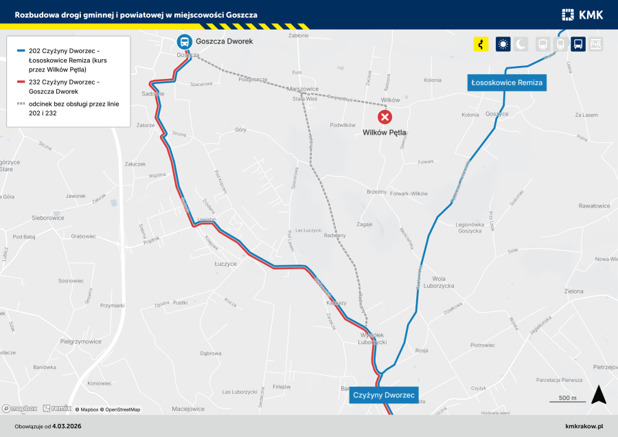 W środę, 4 marca, rozpocznie się kolejny etap robót drogowych w miejscowości Goszcza. W związku z pracami wprowadzone zostaną zmiany w kursowaniu linii aglomeracyjnych nr 202 i 232.