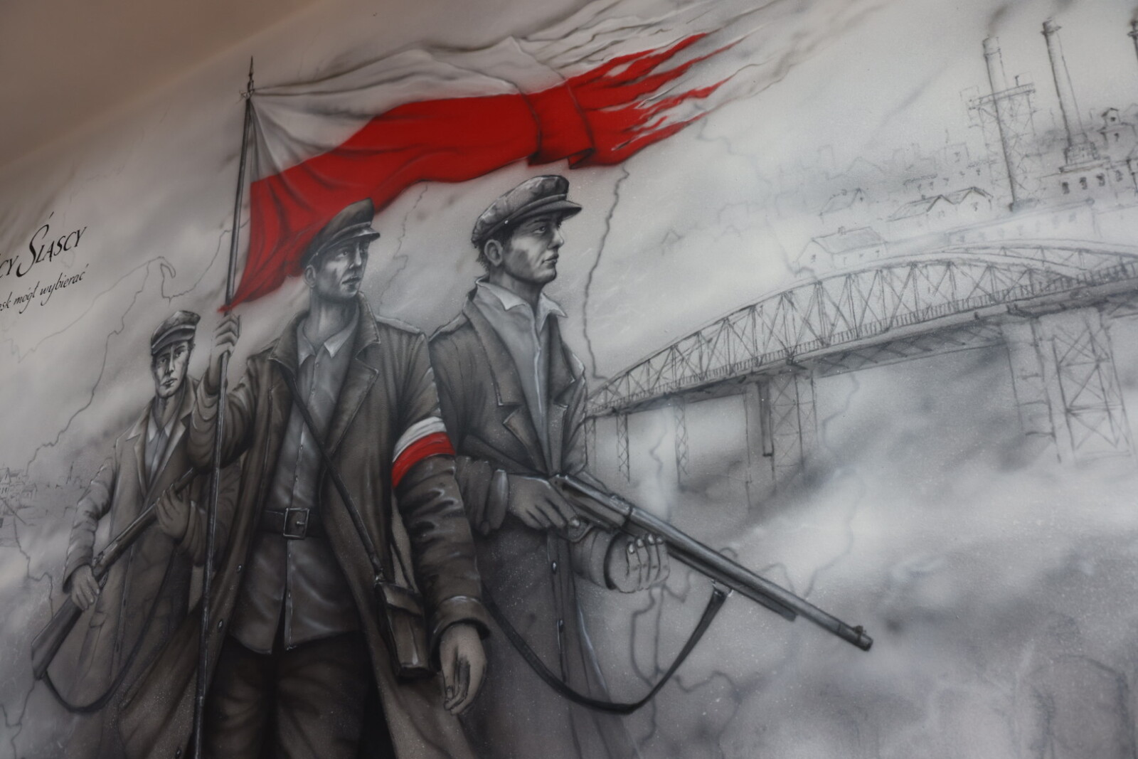 Utrzymany w biało-czarnej kolorystyce z wybijającym się biało-czerwonym akcentem mural został wykonany przez artystę Ariela Kulę i zajmuje tylną ścianę w sali historycznej. Nawiązuje do historii powstań śląskich, losów Śląska i Ślązaków walczących o przynależność do Polski. Opowiada o uniwersalnych wartościach – dążeniu do wolności, determinacji oraz znaczeniu postaw patriotycznych i wartości poświęcenia. Jest współczesną formą przekazywania wiedzy historycznej.