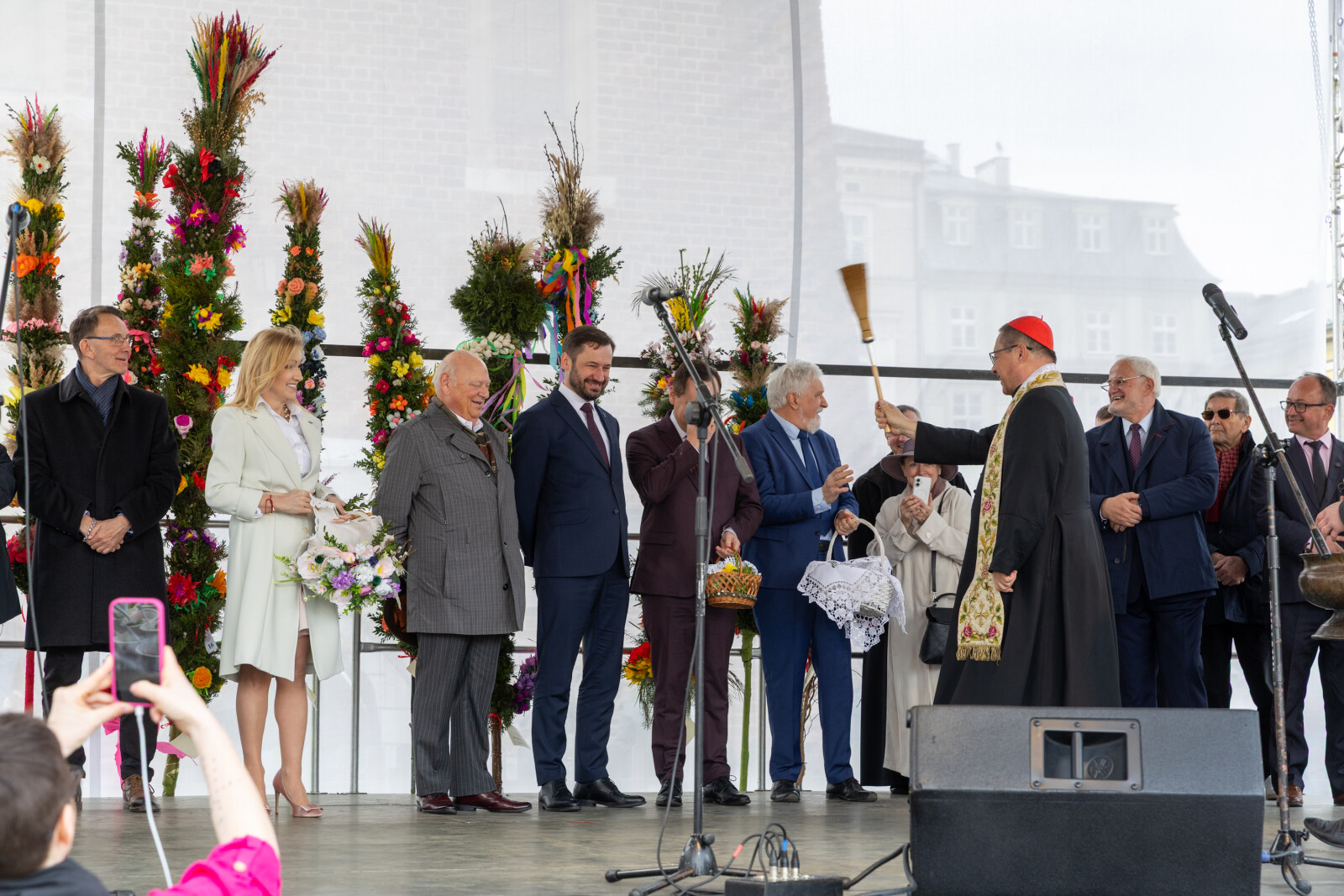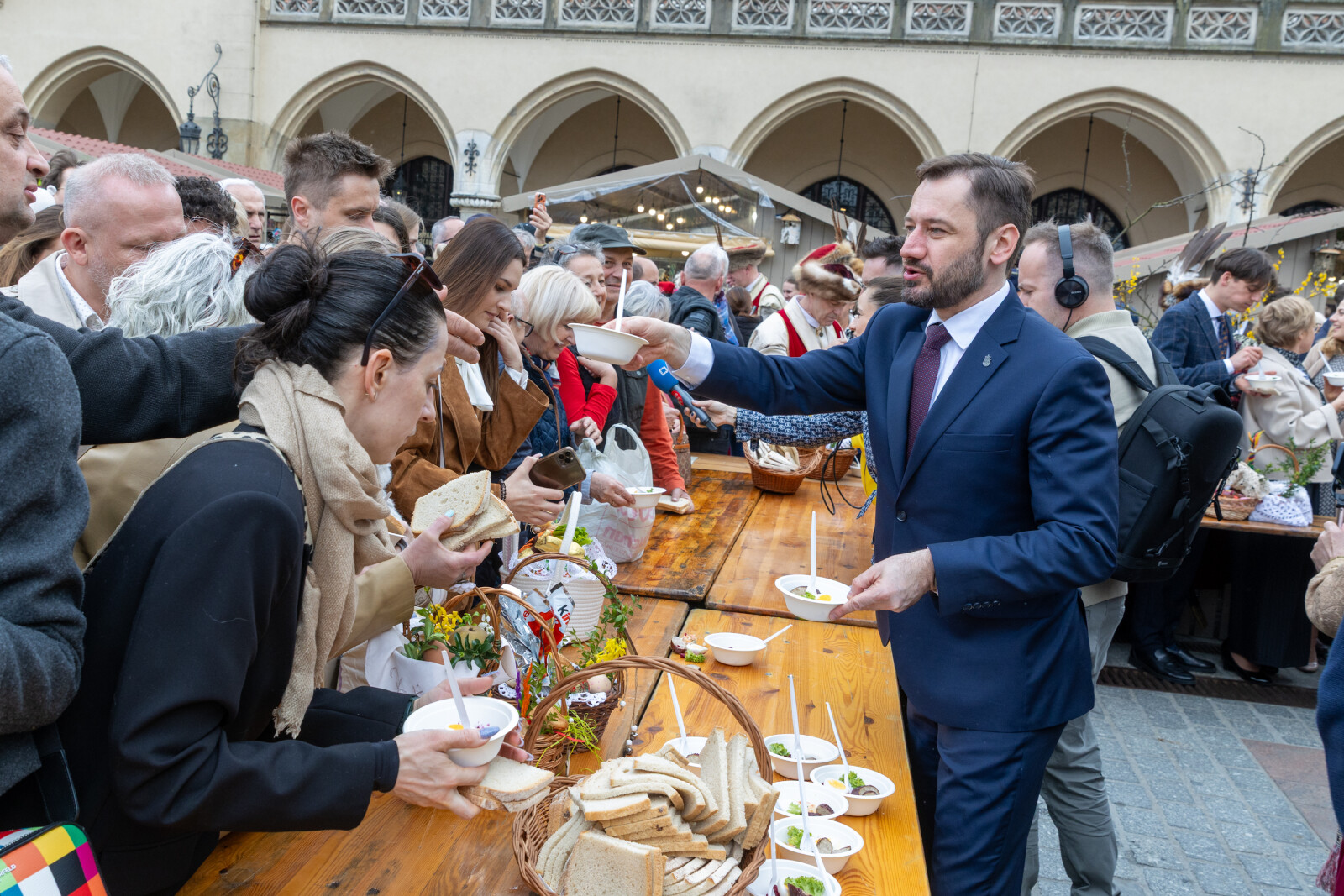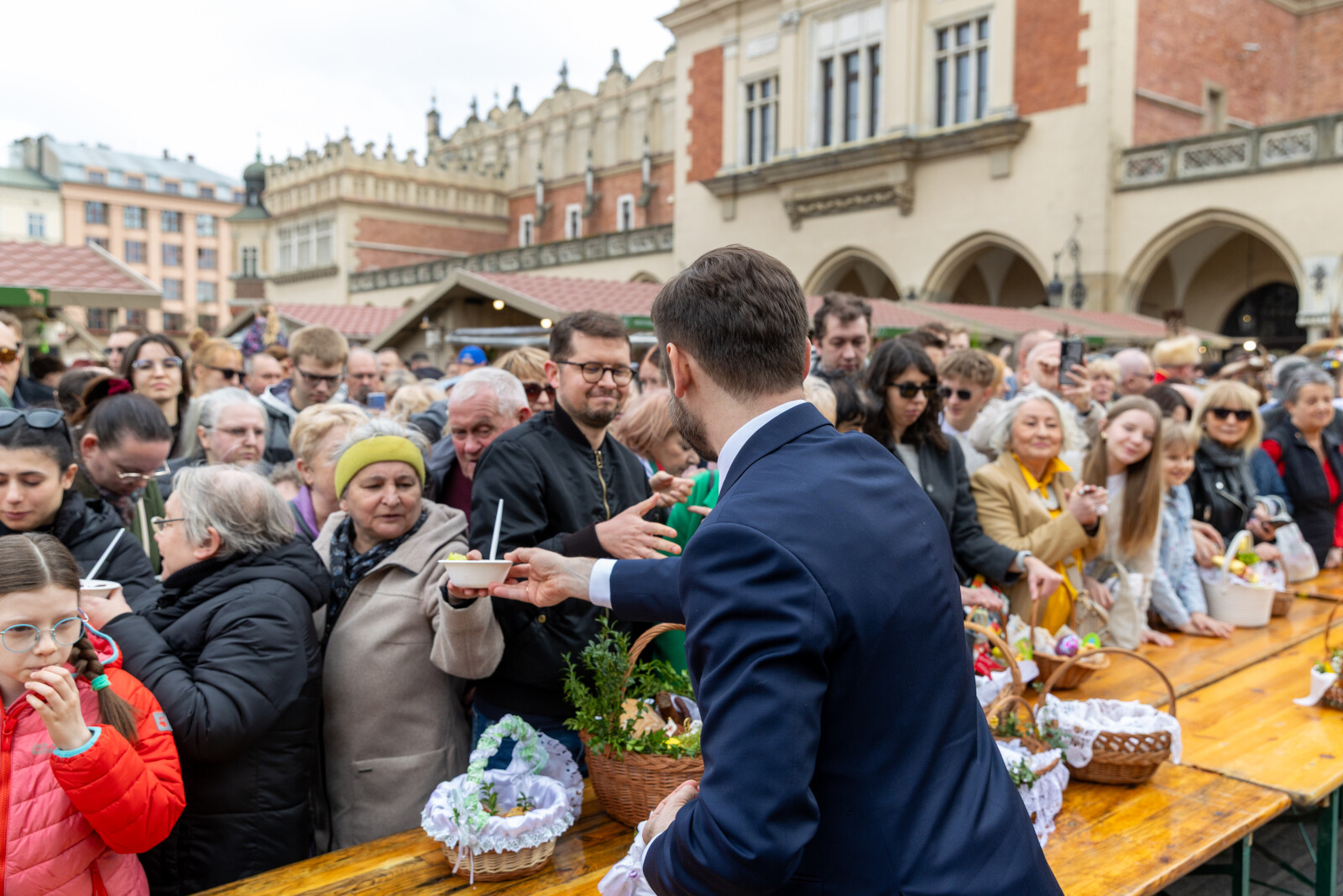 Rynek Główny jest teraz miejscem jarmarku wielkanocnego, który licznie gromadzi zarówno mieszkańców, jak i gości naszego miasta. Właśnie tam, wspólnie z jego organizatorami – Krakowską Kongregacją Kupiecką oraz firmą Artim, wśród barwnych wielkanocnych dekoracji, rękodzieła i tradycyjnych przysmaków, spotkali się na wspólnym składaniu świątecznych życzeń Krakowianom i turystom prezydent Krakowa Aleksander Miszalski, przewodniczący Rady Miasta Krakowa Jakub Kosek oraz metropolita krakowski kard. Grzegorz Ryś, który uroczyście poświęcił koszyczki przyniesione przez zgromadzonych.