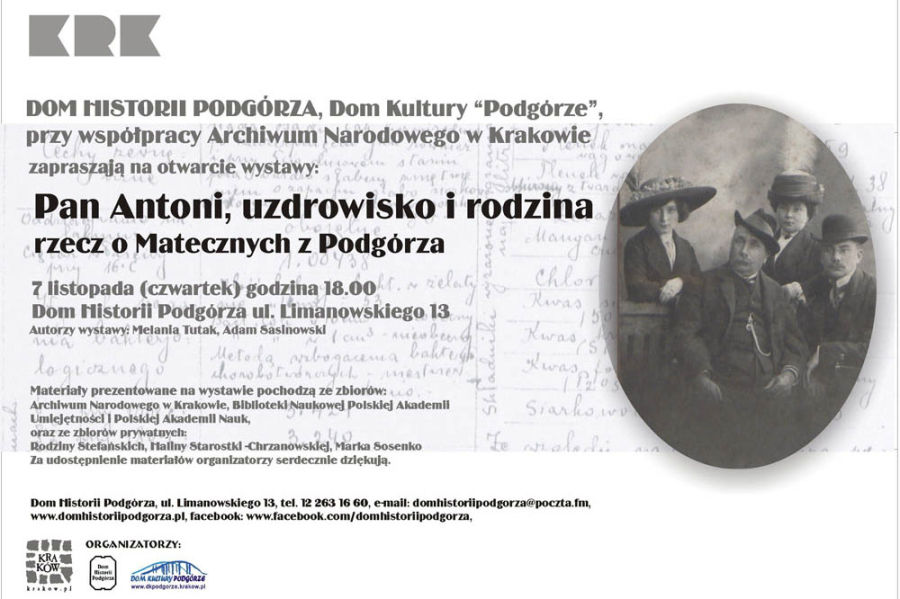 Dom Historii Podgórza oraz Dom Kultury „Podgórze" przy współpracy Archiwum Narodowego w Krakowie zapraszają na otwarcie wystawy „Pan Antoni, uzdrowisko i rodzina – rzecz o Matecznych w Podgórzu", które odbędzie się 7 listopada (czwartek) o godz. 18:00, w Domu Historii Podgórza (ul. Limanowskiego 13).