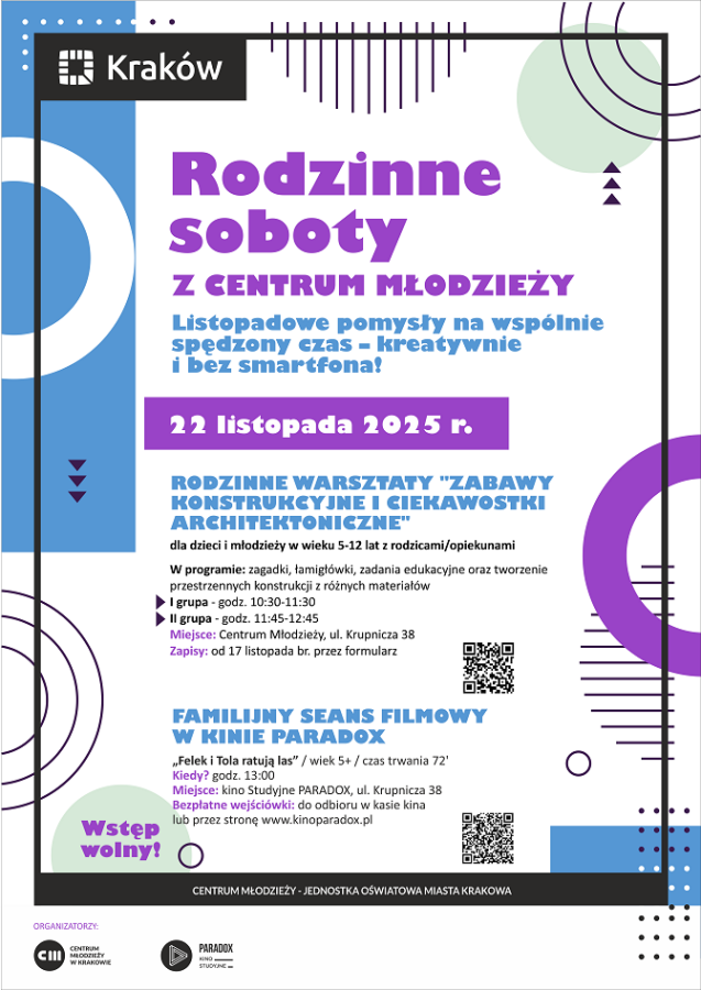 Dziś, 22 listopada Centrum Młodzieży im. dr. H. Jordana zaprasza na drugą z cyklu Rodzinnych Sobót. W programie znajdą się warsztaty konstrukcyjno-architektoniczne dla dzieci z rodzicami oraz familijny seans filmu „Felek i Tola ratują las” w Kinie Paradox. To dobry pomysł na wspólnie spędzony czas – kreatywnie i bez smartfona. Wstęp na wydarzenie jest wolny!