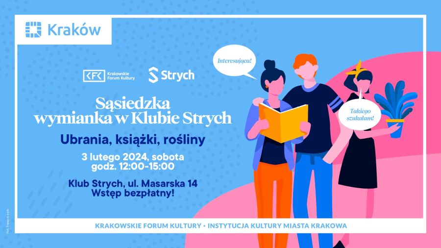 „Sąsiedzka wymianka” w Klubie Strych to przestrzeń, w której nie tylko możecie wymienić się niepotrzebnymi ubraniami, książkami czy roślinami, ale również poznać swoich sąsiadów. Wydarzenie odbędzie się jutro, 3 lutego, w godz. 12.00–15.00, przy ul. Masarskiej 14.