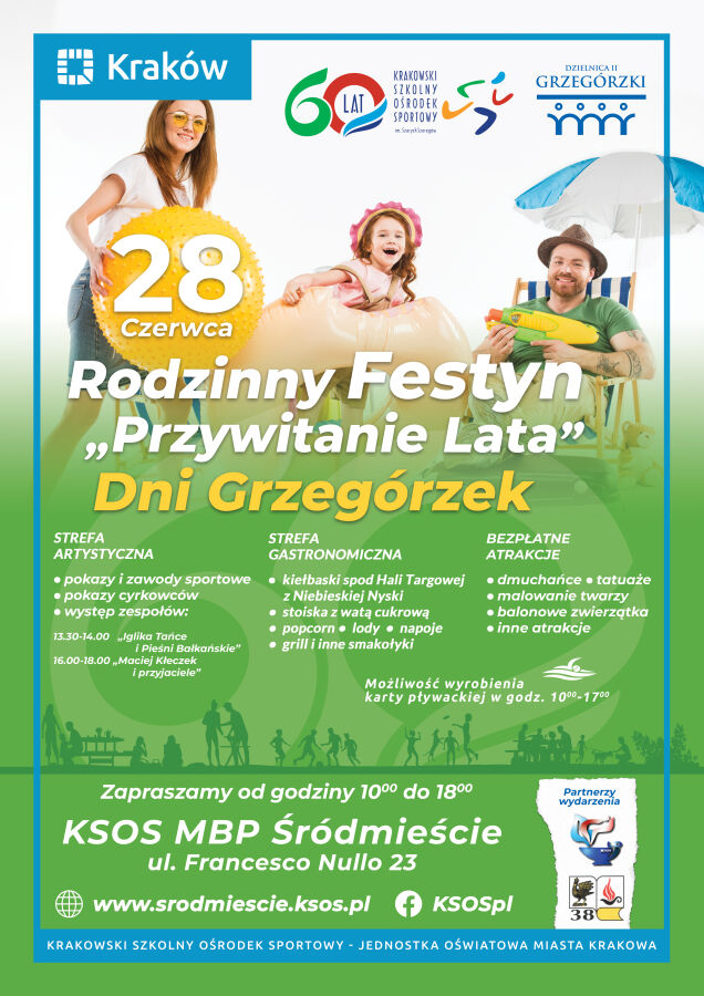 Bezpłatne animacje dla dzieci, występy muzyczne, pokazy sportowe i policyjne to tylko niektóre atrakcje, jakie czekają uczestników festynu rodzinnego „Przywitanie Lata – Dni Grzegórzek”. Wydarzenie odbędzie się w sobotę, 28 czerwca, w godz. od 10.00 do 18.00 na terenie Krakowskiego Szkolnego Ośrodka Sportowego przy ul. ul. Francesco Nullo 23.