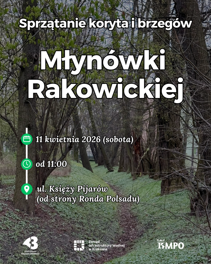 Organizatorami akcji sprzątania koryta i brzegów Młynówki Rakowickiej są Rada Dzielnicy III Prądnik Czerwony, Zarząd Infrastruktury Wodnej w Krakowie i Miejskie Przedsiębiorstwo Oczyszczania Sp. z o.o. w Krakowie. Uczestnicy akcji otrzymają rękawiczki i worki do sprzątania terenu w miejscu zbiórki na końcu ul. Księży Pijarów (od strony ronda Polsadu). Po uporządkowaniu terenu osoby zaangażowane w sprzątanie otrzymają upominki. Organizatorzy nie zapewniają ubezpieczenia uczestników akcji.