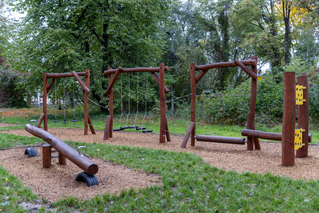 W północnej części znajduje się strefa zabaw z drewnianą min kolejką, chatką, ścieżką sprawnościową i huśtawkami. Dla dorosłych przygotowano miejsce do ćwiczeń na urządzeniach wykorzystujących siłę własnych mięśni, a dla spragnionych relaksu – strefę z leżakami i hamakami. Miłośnicy psów mają tam dostępny ogrodzony wybieg dla swoich pupili.