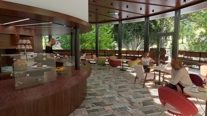 Budynek ma kształt rotundy w kondygnacji parteru z pełnymi przeszkleniami w części kawiarnianej. Otoczony jest tarasem. Projekt uwzględnia modernizację tego miejsca z troską o szczegóły charakterystyczne dla obiektu, który wpisany jest do rejestru zabytków. Utrzymana zostanie chociażby drewniana podbitka podcieni, kamienna posadzka składająca się z charakterystycznych marmurów, wapieni i dolomitów, przywrócenie pierwotnej kolorystyki baru, czy specyficznych punktowych lamp w czarnych oprawach w kształcie walca.