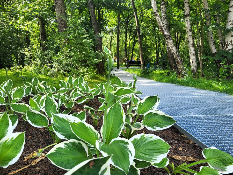 Drugą ważną kwestią jest ich odporność na wilgoć, gdyż teren jest zacieniony i wilgotny, a kraty nie nasiąkają wodą i nie butwieją jak drewno.