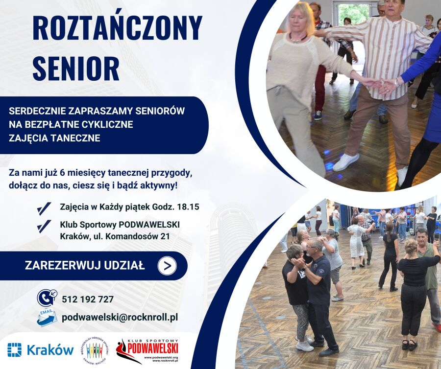 „Roztańczony senior” to wyjątkowa inicjatywa skierowana do seniorów Gminy Miejskiej Kraków, która łączy pasję do tańca, aktywność fizyczną oraz integrację społeczną. Bezpłatne zajęcia odbywają się w każdy piątek o godz. 18.15 w Klubie Sportowym Podwawelski przy ul. Komandosów 21.