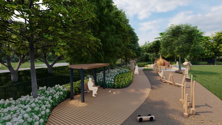 Wśród atrakcji dla najmłodszych przewidziano m.in.: tor przeszkód, ściankę wspinaczkową, drabinki, huśtawkę typu bocianie gniazdo oraz tablice manipulacyjne. Pod urządzeniami do zabawy będzie bezpieczna nawierzchnia EPDM. Całość uzupełnią elementy małej architektury i wyposażenia terenu m.in. ławki, wiata z siedziskami, ławko-huśtawka, stojaki rowerowe, drogowskaz, tablice informacyjne i dekoracyjna rzeźba parkowa – wiewiórka z siedziskiem.
