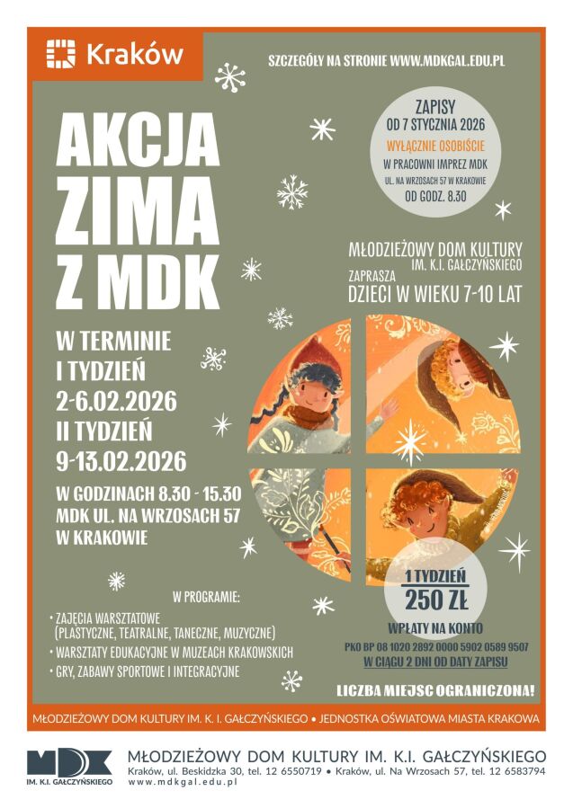 Młodzieżowy Dom Kultury im. K.I. Gałczyńskiego zaprasza dzieci w wieku 7-10 lat do uczestnictwa w akcji „Zima z MDK”. Zapisy ruszają już 7 stycznia w pracowni imprez MDK na ul. Na Wrzosach 57.