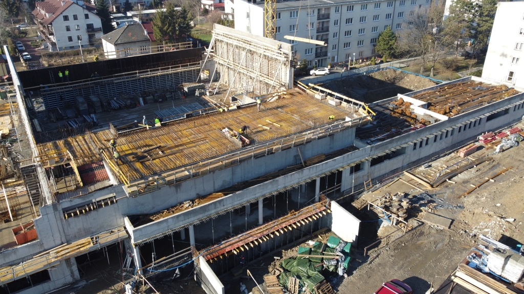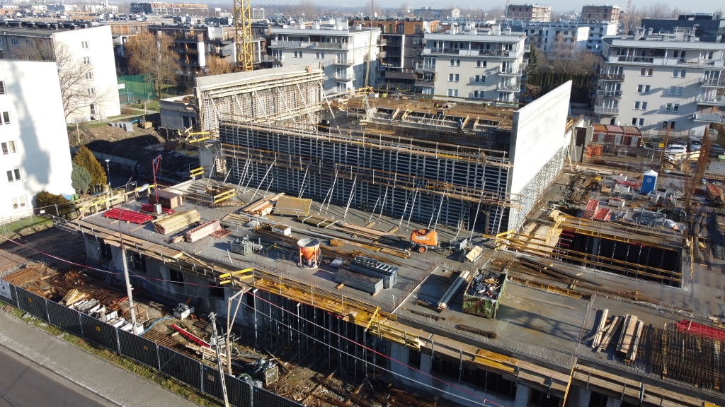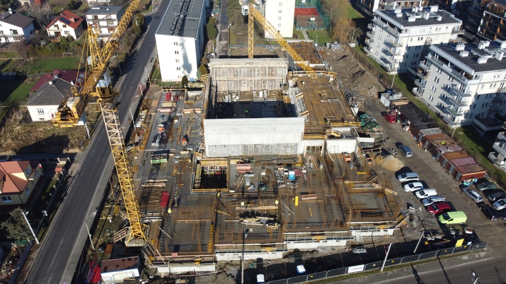W ramach robót budowlanych zrealizowano już część podziemną i parterową szkoły oraz izolację przeciwwodną fundamentów. Obecnie trwają prace nad wznoszeniem żelbetowej konstrukcji budynku szkoły. Na poziomie pierwszego piętra wzniesiono już część ścian sali gimnastycznej, a lokalnie wznoszona jest żelbetowa konstrukcja drugiego piętra. W piwnicy trwają prace w zakresie stawiania ścianek działowych oraz roboty instalacyjne. Realizowany jest także zewnętrzny zbiornik retencyjny dla wody opadowej. Wkrótce powinny się rozpocząć prace związane z przykryciem prefabrykowaną konstrukcją hali sportowej.