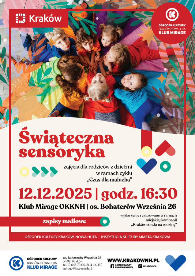 Wydarzenie jest bezpłatne i realizowane w ramach miejskiej kampanii „Kraków stawia na rodzinę”. Zapisy odbywają się drogą mailową: mirage@krakownh.pl. Liczba miejsc jest ograniczona.