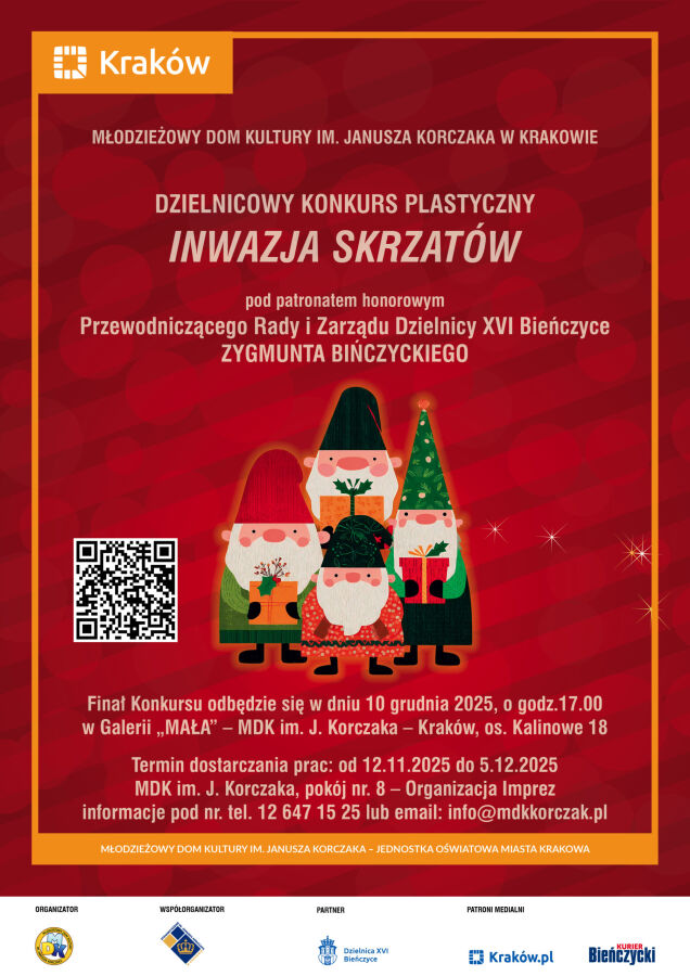 Wielki finał już 10 grudnia o godz. 17.00. Tego dnia zostaną ogłoszone wyniki konkursu – na zwycięzców czekają atrakcyjne nagrody! Wszystkie zgłoszone prace zostaną zaprezentowane na świątecznej wystawie, a dziesiątki barwnych skrzatów opanują MDK, dodając domowi kultury prawdziwie bożonarodzeniowego uroku.