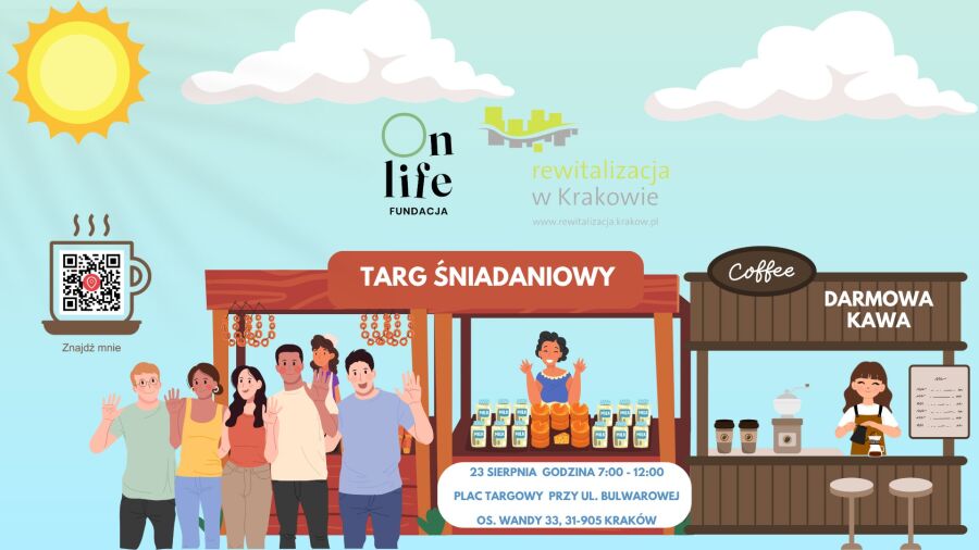 W sobotni poranek, 23 sierpnia, plac targowy przy ul. Bulwarowej (os. Wandy 33) w krakowskiej Mogile stał się miejscem wyjątkowego wydarzenia. Wraz z Fundacją ON LIFE zaprosiliśmy mieszkańców Krakowa na śniadaniowe pożegnanie lata – plenerową inicjatywę łączącą lokalne smaki, dobrą muzykę i sąsiedzką atmosferę.