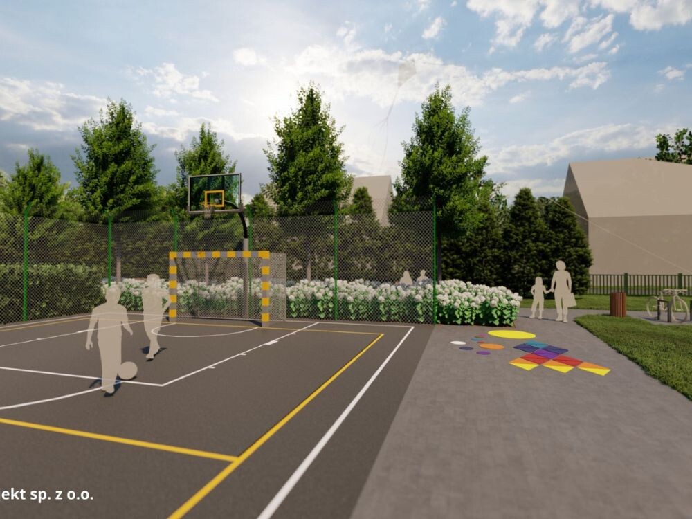 Dodatkowo pojawią się gry podwórkowe wkomponowane w nawierzchnię – klasy, rakieta czy kalkulator – które przywołają klimat dawnych zabaw i zachęcą do wspólnego spędzania czasu. Nie zapomniano także o komforcie, który zapewnią wygodne ławki, miejsca do odpoczynku, stojaki na rowery, kosze na śmieci oraz elementy dające cień w słoneczne dni.