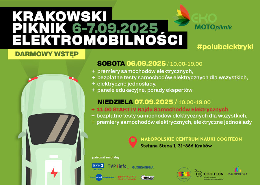 Krakowski Piknik Elektromobilności odbędzie się w 6 i 7 września (sobota i niedziela) w godz. 10.00-19.00 przy Cogiteon Małopolskie Centrum Nauki.