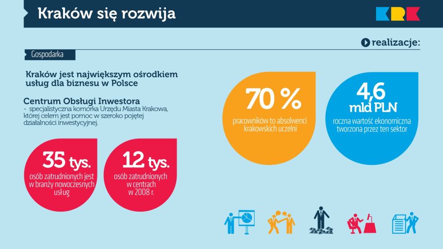 Branża nowoczesnych usług zatrudnia obecnie w Krakowie 35 000 osób. W 2008 roku krakowskie centra zatrudniały ok. 12 000, a w 2015 liczba ta sięgnąć ma 38 000 osób. Co ważne – 70 proc. pracowników to absolwenci krakowskich uczelni, a roczna wartość ekonomiczna tworzona przez ten sektor to 4,6 mld zł. Tylko w tym roku przybędzie w Krakowie 115 tysięcy m² przestrzeni biurowej.