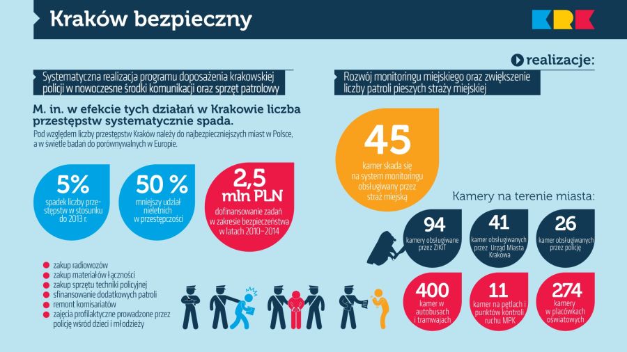 Gorącym tematem ostatnich lat jest kwestia szeroko pojmowanego bezpieczeństwa w mieście. Zapewnienie obywatelom bezpieczeństwa jest podstawnym zadaniem Państwa. Samorząd gminy może jedynie podejmować działania uzupełniające i wspierające ten obszar, co też od lat konsekwentnie czyni. Jak wynika z danych, którymi dysponuje policja, liczba przestępstw w Krakowie systematycznie spada. W porównaniu z innymi dużymi miastami Kraków jest miastem stosunkowo bezpiecznym. By wesprzeć działanie służb odpowiedzialnych za bezpieczeństwo w ostatnich czterech latach przekazano 2,5 mln zł na zakup m. in. radiowozów, materiałów łączności, remonty komisariatów czy zajęcia profilaktyczne.
