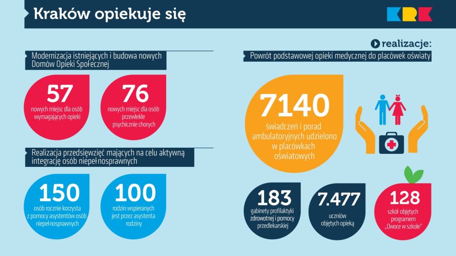 Przez ostatnie cztery lata szczególny nacisk został położony na pomoc osobom znajdującym się w trudnej sytuacji życiowej, chorym, niepełnosprawnym, starszym. Miejski Ośrodek Pomocy Społecznej objął swoją pomocą blisko 40 tysięcy osób. Sukcesywnie zwiększa się liczba miejsc w domach pomocy społecznej – obecnie 17 placówek zapewnia blisko 2 tys. miejsc (ostatnio, 60 miejsc uruchomiono w sierpniu). Bezpośrednio przekłada się to na znaczne skrócenie kolejek do domów – czas oczekiwania na przyjęcie do placówki dla osób w podeszłym wieku oraz osób somatycznie chorych to już tylko 3 miesiące, co jest ewenementem w skali kraju. Jak zawsze, osoby wymagające natychmiastowej opieki, do placówek przyjmowane są niezwłocznie. W latach 2010-2012 w krakowskich domach pomocy społecznej przeprowadzono inwestycje i remonty dzięki którym wszystkie uzyskały wpis do rejestru wojewody, posiadają wymagany standard w zakresie zatrudnienia, opieki oraz warunków mieszkaniowych. Krakowscy seniorzy mogą korzystać z pobytu w dziennych ośrodkach wsparcia. Ich sieć jest ciągle rozwijana. Obecnie z oferty placówek korzysta 1200 seniorów.
