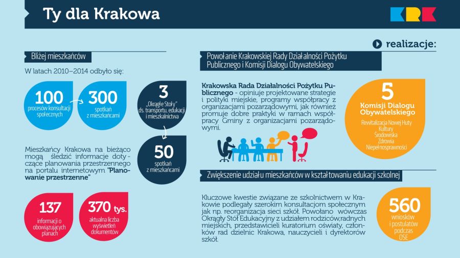 Szczególną uwagę należy zwrócić na zwiększenie udziału mieszkańców w kształtowaniu przestrzennym. W ramach procedur związanych z przygotowywaniem miejscowych planów zagospodarowania przestrzennego odbywały się dyskusje publiczne i spotkania z mieszkańcami. Dzięki tym konsultacjom udało się sprawnie uchwalać kolejne plany - w ciągu ostatnich czterech lat aż 73. Obecnie Kraków ma już 151 planów miejscowych obejmujących ponad 54 proc. powierzchni miasta.