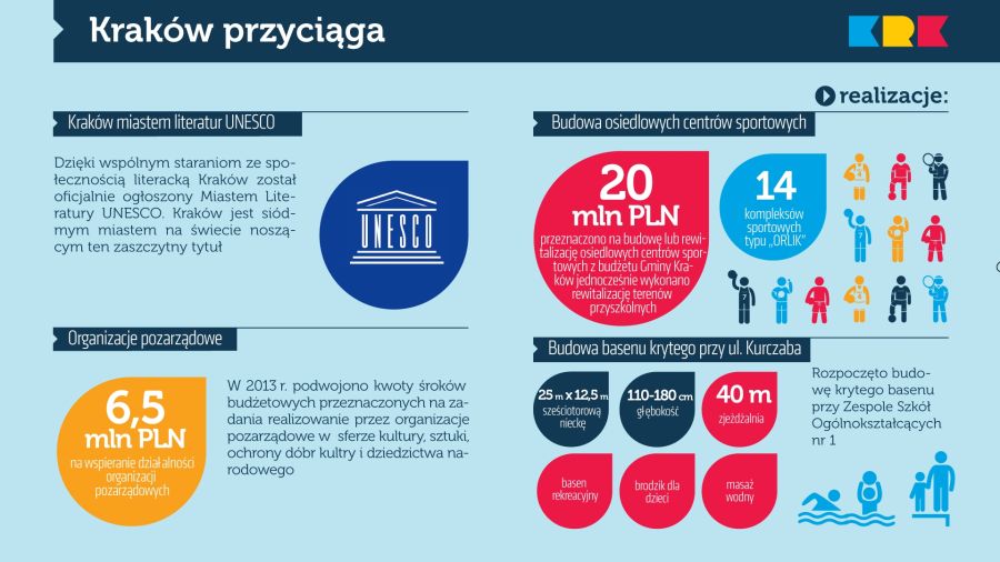 Żeby jednak można się było cieszyć wynikami polskich, krakowskich sportowców potrzebne są inwestycje, z których będą mogli korzystać amatorzy w każdym wieku. Dlatego nacisk położono na budowę osiedlowych centrów sportowych oraz boisk przyszkolnych. Takich wielofunkcyjnych centrów powstało już 15, a kolejne są budowane. Wyremontowano też 18 boisk przyszkolnych, a 5 szkół wzbogaciło się o nowe sale gimnastyczne.