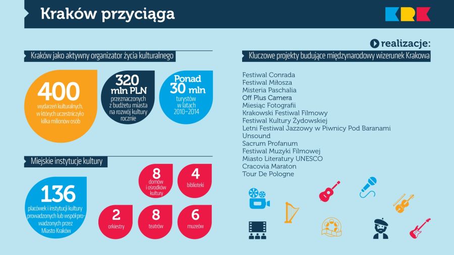 Przed nami – dzięki otwarciu Kraków Areny – wiele wspaniałych wydarzeń kulturalnych. Warto pamiętać jednak o tym, co już teraz osiągnięto. Parada Smoków organizowana przez Teatr Groteska znalazła się w zestawieniu 50 najważniejszych wydarzeń kulturalnych na świecie. Rekordy popularności biją „Krakowskie noce”. Każdego roku korzysta z tej formy zwiedzania i uczestniczenia w wydarzeniach kulturalnych 200 tysięcy osób. Trudno nie wspomnieć tutaj festiwali budujących międzynarodowy wizerunek Krakowa – Festiwal Conrada, Festiwal Miłosza, Misteria Paschalia, czy Sacrum Profanum, który uzyskał status jednego z najciekawszych wydarzeń muzycznych Europy.