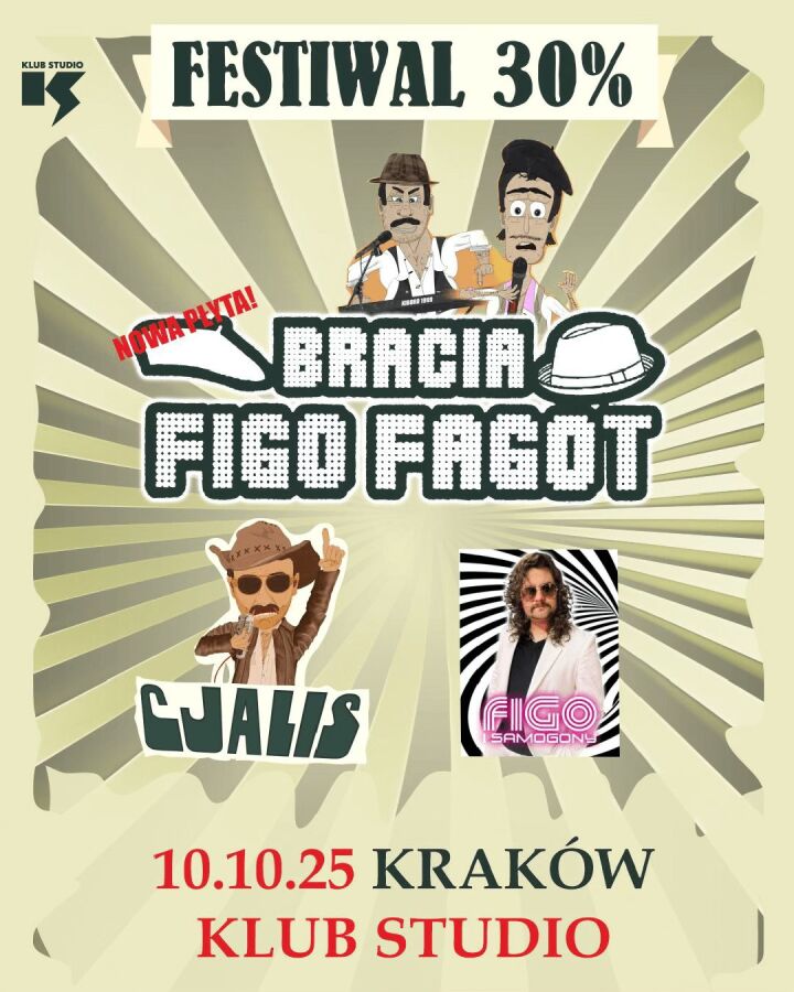 Po pół rocznej przerwie szalony Żuk festwalu 30 proc. znowu odpalił, a nawet więcej! Ruszył! Już tej jesieni skłócona ferajna w składzie Bracia Figo Fagot, Cjalis oraz Figo i Samogony ruszą przez Polskę długą i szeroką, aby bawić się na całego! Na 30 proc.
