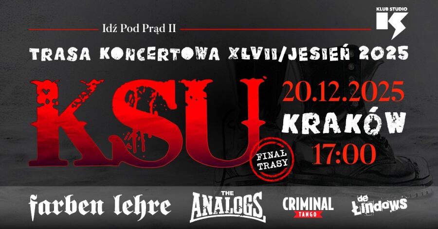 Trwa trasa koncertowa „Idź pod prąd II”, podczas której KSU odwiedza największe miasta i kluby w Polsce, a także Dodrecht (Holandia) i Londyn (Wielka Brytania). Na koncertach usłyszycie zarówno najbardziej znane utwory KSU jak i te nowsze, w odświeżonej setliście. W Krakowie KSU zagra z przyjaciółmi z zespołów: The Analogs, Farben Lehre, Cryminal Tango oraz De Łindows.
