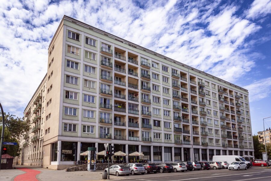 The French Block, built between 1957 and 1959 to a design by Kazimierz Chodorowski, is an architectural experiment in the spirit of modernism. It was created in collaboration between designers from the Krakow University of Technology and contractors from the Unified City Building Association, using vented concrete, an innovative material that provides high strength with minimal wood use and cost. The 74-metre-long eight-storey block, with its distinct rhythm of balconies and loggias, is an example of thoughtful metropolitan design, and the glazed ground floor with its rounded corners still retains its modernist charm today. It housed, among others, a furniture store, the PTTK Club and the Orbis travel agency office, with modern interiors designed by Irena Pać-Zaleśna, Zdzisław Szpyrkowski and Alina Zięba. Together with the neighbouring, equally innovative Swedish Block, it forms the emblematic space of the Nowa Huta 'thaw', illustrating the implementation of Le Corbusier's ideas about architecture open to light, air and greenery. It was its modern technology, pastel colours and Western interior atmosphere that earned it the name 'the French Block'.