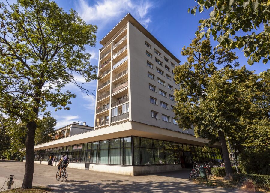 The Helicopter Block, built between 1957 and 1961, is one of the most distinctive examples of post-1956 modernism in Nowa Huta. Situated right next to the socialist realist buildings of Central Square, it symbolically marks the boundary between the 'old' and 'new' Nowa Huta. The ten-storey skyscraper is flanked at ground level by a retail and service pavilion with a glass façade, which, in combination with the lightness of the structure and the characteristic 'winged' roof in the spirit of Le Corbusier, gives the impression of hovering above the ground. The block with its large loggias and windows provides for residential, office and artistic functions, including spaces for the studios of artists such as Marian Kruczek. The top floor housed, among other things, a painter's studio, terrace and drying room, while the ground floor was filled with commercial and retail units, designed in a modern, colourful style. The Helicopter won acclaim from local residents – in 1961 it won the Voice of Nowa Huta plebiscite for the best residential house in the district – and remains to this day an icon of architecture of the thaw period, combining functionality with a clear artistic identity.