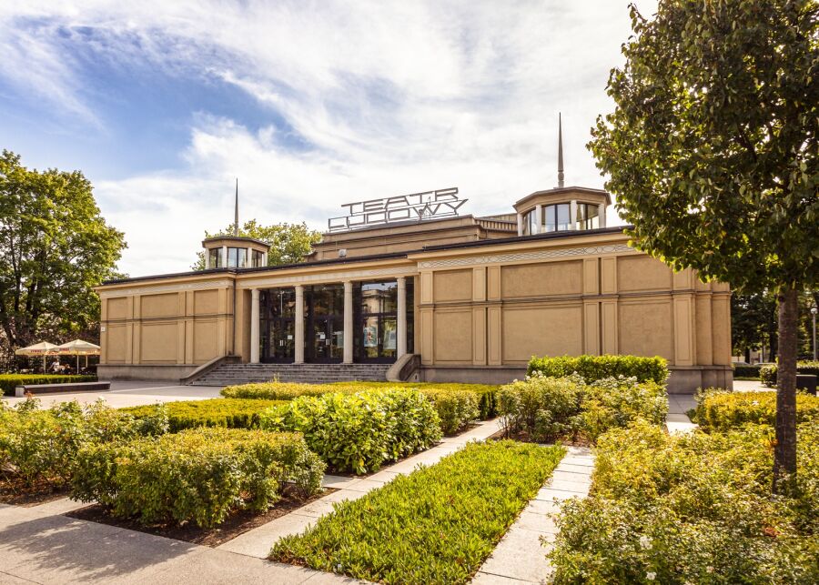 Built in 1954-1955 as the first theatre in Nowa Huta, the People's Theatre was intended as an intimate stage, but after the abandonment of the Grand Theatre in Central Square, it became the district's main theatrical institution. The building's architecture combines socialist-realist principles with classicist elegance – the harmonious body is crowned by glazed architectural lanterns, and the interiors with marble, mirrors and crystal chandeliers are reminiscent of the Empire style. The interior design was created in collaboration between Janusz Ingarden and Krystyna Wąsowicz. The theatre, which opened on 3 December 1955 with a performance of Wojciech Bogusławski's play 'Cud mniemany, czyli Krakowiacy i Górale [The Supposed Miracle, or Cracovians and Highlanders]', gave its name not only to the Theatre estate, but also to the neighbouring Krakowiacy (Cracovians) and Górale (Highlanders) estates. The building is one example of Nowa Huta's socialist realism embedded in the tradition of pre-war architecture and still serves its original function today.