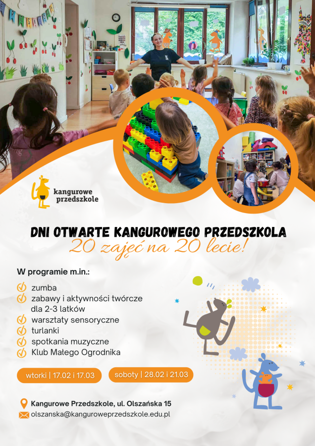 W ramach obchodów 20-lecia działalności Kangurowe Przedszkole przygotowało cykl Dni Otwartych, podczas których rodziny będą mogły wziąć udział w różnorodnych zajęciach edukacyjnych i ruchowych. W programie zaplanowano m.in. zajęcia z zumby, zabawy i aktywności twórcze dla dzieci w wieku 2–3 lat, warsztaty sensoryczne, turlanki, spotkania muzyczne z wykorzystaniem bum bum rurek oraz zajęcia w ramach Klubu Małego Ogrodnika.