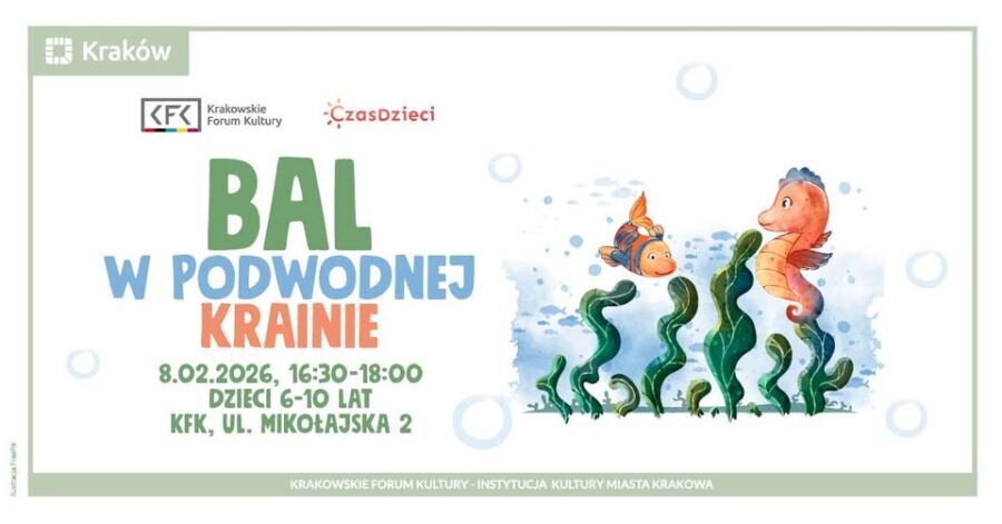 Krakowskie Forum Kultury zaprasza dzieci w wieku od 6 do 10 lat na radosny, podwodny bal pełen tańca i zabawy. W programie wydarzenia znalazły się gry i zabawy integracyjne, „morska fala” z chusty animacyjnej, dziecięca zumba oraz minidisco. Organizatorzy zachęcają nie tylko dzieci, ale także opiekunów do założenia tematycznych, morskich przebrań.