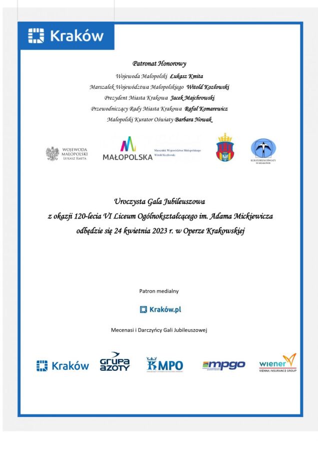 24 kwietnia 2023 r. w Operze Krakowskiej odbędzie się uroczysta gala jubileuszowa z okazji 120-lecia VI Liceum Ogólnokształcącego im. Adama Mickiewicza. Patronat honorowy nad wydarzeniem objął Przewodniczący Rady Miasta Krakowa Rafał Komarewicz.