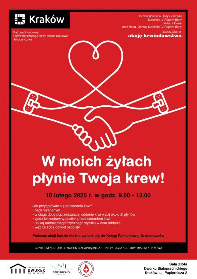 Rada i Zarząd Dzielnicy IV Prądnik Biały organizuje akcję krwiodawstwa już od 2023 roku. Tegoroczna, ósma edycja odbędzie się w kilku terminach, najbliższy to 26 maja. Rada i Zarząd Dzielnicy IV. Akcję objął patronatem Jakub Kosek Przewodniczący Rady Miasta Krakowa.