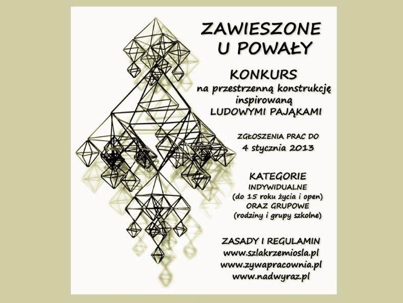 ŻyWa Pracownia i Szlak Tradycyjnego Rzemiosła zapraszają dzieci i dorosłych do udziału w konkursie "Zawieszone u powały" na przestrzenną konstrukcję inspirowaną ludowymi pająkami – tradycyjnymi ozdobami wieszanymi w domach u powały w okresie Świąt Bożego Narodzenia. Konkursowa konstrukcja powinna nawiązywać swoją formą do jednego z rodzajów pająków. Może zostać wykonana z tradycyjnych lub współczesnych materiałów i stanowić element ozdobny lub użytkowy.