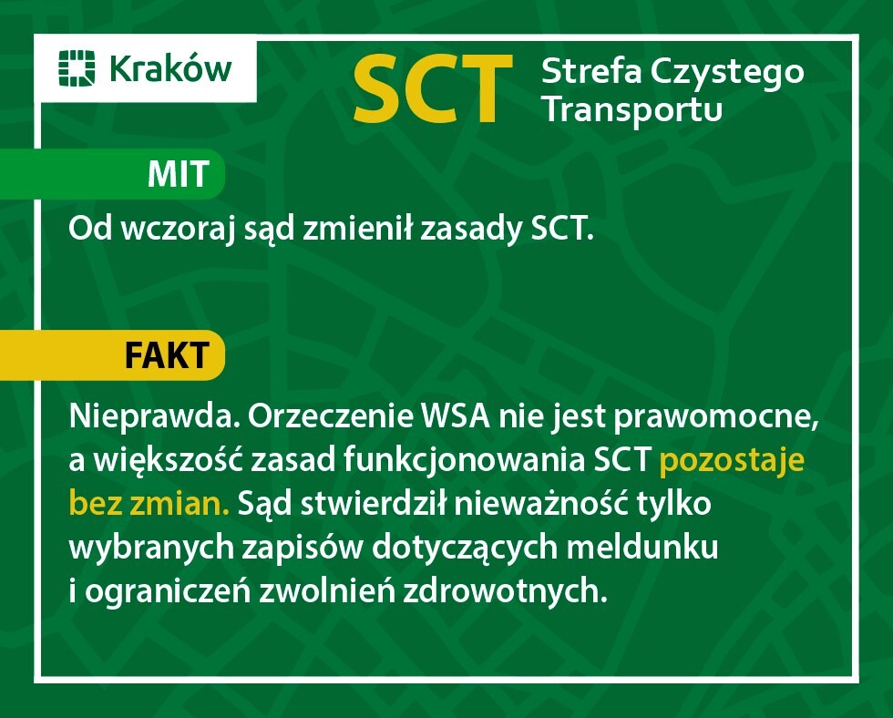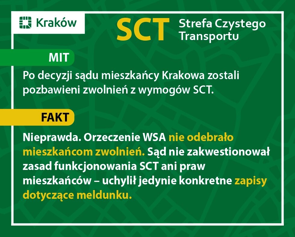 - Prawa mieszkańców Krakowa do zwolnień z wymogów SCT zostały zachowane. Sąd uchylił jedynie konkretne zapisy techniczne dotyczące meldunku.