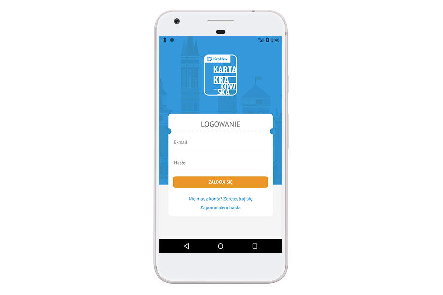 Po zainstalowaniu aplikacji, należy się zalogować, podając ten sam adres e-mail i to samo hasło, które zostało podane podczas składania wniosku i zakładania konta mobilnej Karty Krakowskiej.