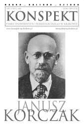 Wrześniowy numer „Konspektu" w całości poświęcony został Januszowi Korczakowi — wybitnemu pedagogowi, opiekunowi dzieci, człowiekowi, który życiem poświadczył niezbywalną moc idei służenia bliźniemu. Zeszyt, który składamy w ręce Czytelników stanowi próbę wielogłosowego omówienia różnych aspektów działalności Starego Doktora. Zebrane w nim wypowiedzi pedagogów, literaturoznawców, medioznawców i historyków wpisują się w obchodzony również na Uniwersytecie Pedagogicznym Rok Janusza Korczaka. Zapraszamy do lektury.
