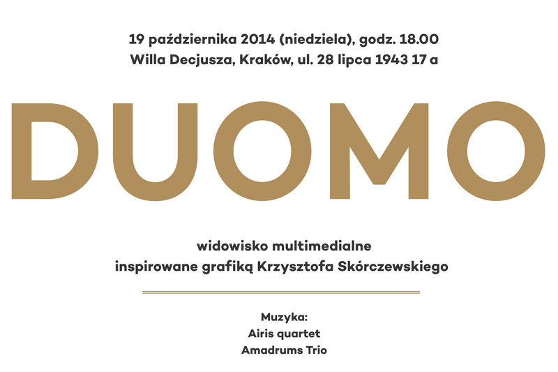 Dzisiaj, 19 października, w Willi Decjusza o godz. 18.00 odbędzie się widowisko multimedialne pt. „Duomo" („Katedra") inspirowane grafiką jednego z najbardziej utytułowanych mistrzów miedziorytu – Krzysztofa Skórczewskiego. Tradycyjny obraz wykonany w technice znanej już w XVI wieku zostanie przetworzony w interaktywny i trójwymiarowy format połączony z muzyką wykonywaną na akustycznych instrumentach.