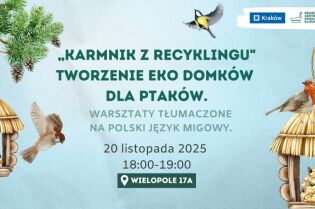 Jak z niepotrzebnych rzeczy zrobić ekodomek dla ptaków? Dowiedzą się tego uczestnicy warsztatów „Karmnik z recyklingu” w Krakowskim Centrum Edukacji Klimatycznej przy ul. Wielopole 17a. Zajęcia odbędą się dziś, 20 listopada, o godz. 18.00. Dzięki tłumaczeniu na Polski Język Migowy, będą w pełni dostępne dla osób z niepełnosprawnością słuchu.