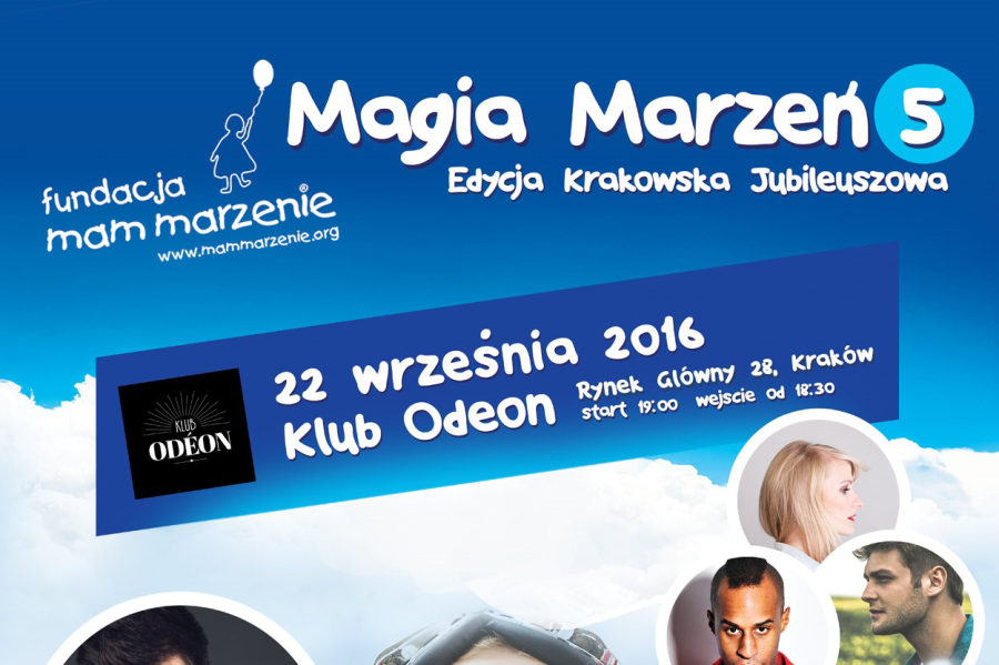 Już po raz piąty Fundacja Mam Marzenie zaprasza na koncert charytatywny "Magia Marzeń – edycja krakowska jubileuszowa", który odbędzie się 22 września o godzinie 19 w klubie Odeon na Rynku Głównym 28 w Krakowie.