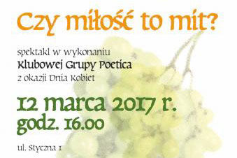Klub Dukat zaprasza dorosłych krakowian na spektakl teatralny, który co roku z okazji Dnia Kobiet przygotowuje klubowa Grupa Poetica. W niedzielę, 12 marca, o godz. 16 członkowie Grupy zagrają w przedstawieniu „Czy miłość to mit?”, według scenariusza Lucyny Rutkowskiej, w reżyserii Magdaleny Rutkowskiej-Oliwy.