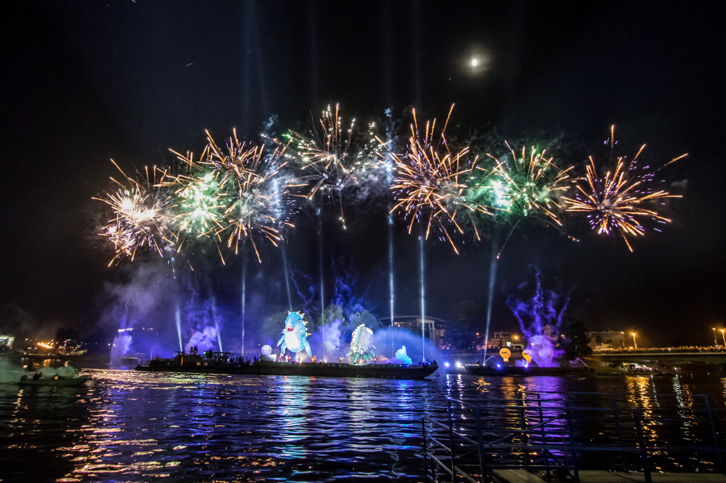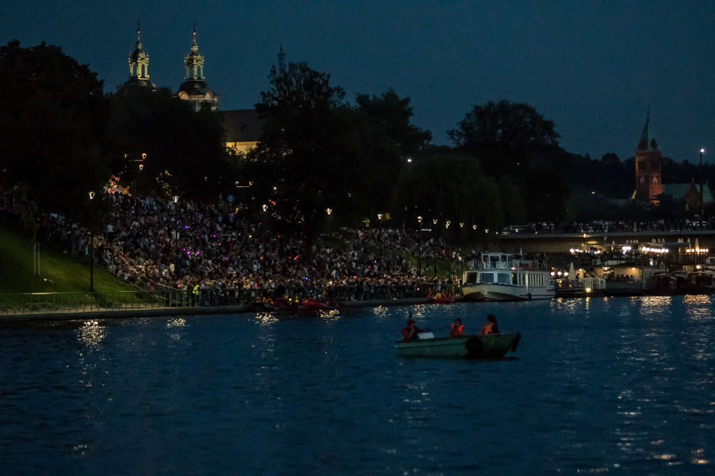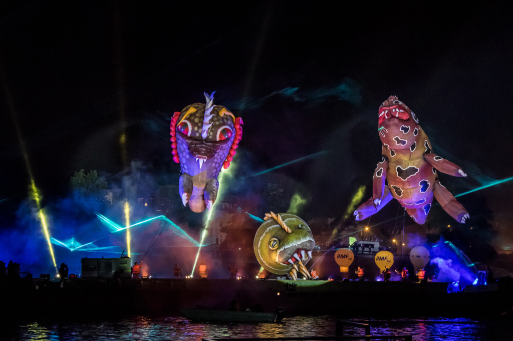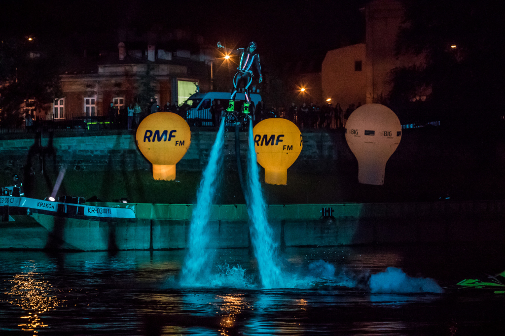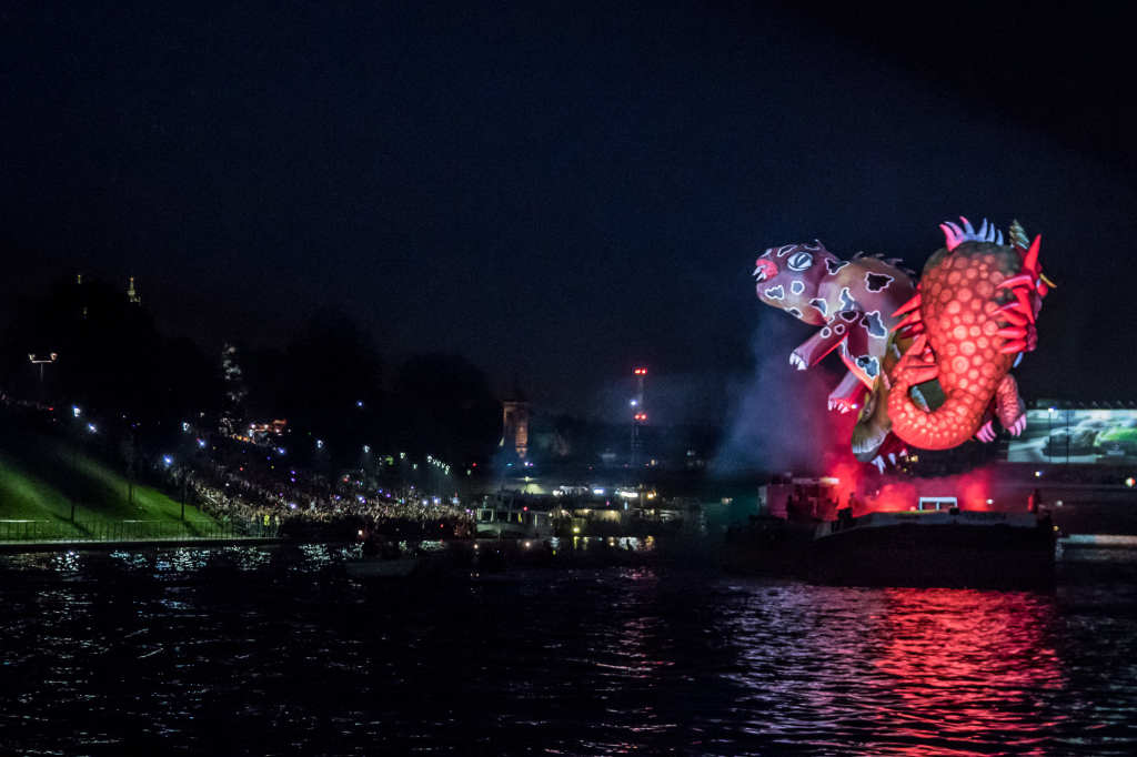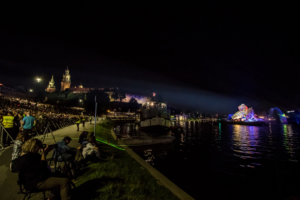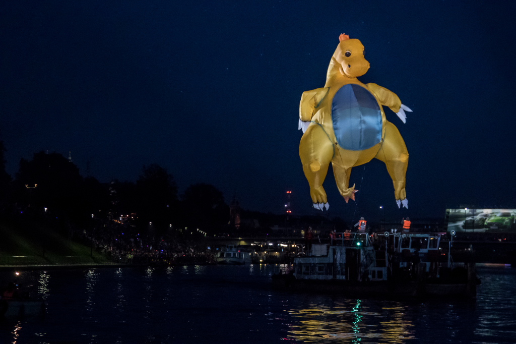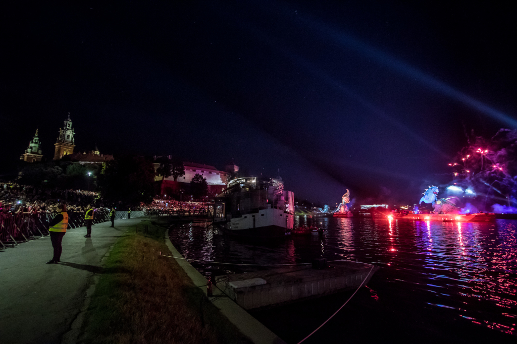 W sobotę o godz. 22 przy Zakolu Wisły pod Wawelem odbyło się niezapomniane widowisko z wykorzystaniem efektów pirotechnicznych, zaskakującej oprawy świetlnej i laserowej oraz gigantycznych kurtyn wodnych, a także pięknej muzyki. Największą atrakcją były ogromne latające smoki, animowane na barkach i statkach przez aktorów Teatru Groteska. Z głośników popłynęła muzyka m.in. Maurice’a Ravela, Gorana Bregovica czy Hansa Zimmera. Podniebną prezentację smoków poprzedził pokaz lotniarzy oraz flyboard na Wiśle.