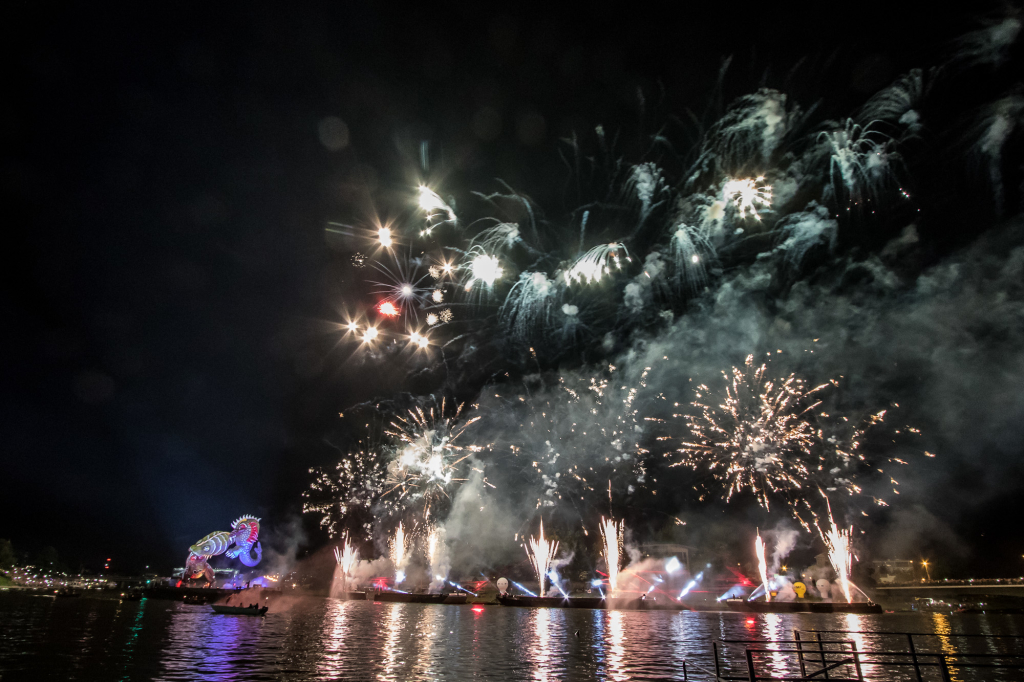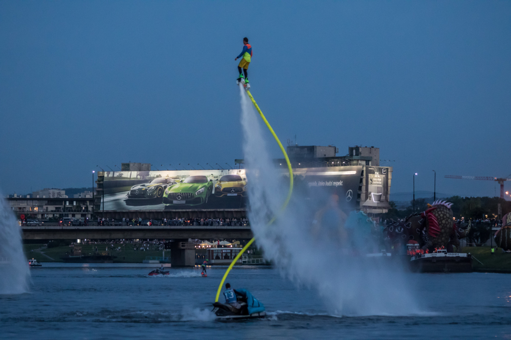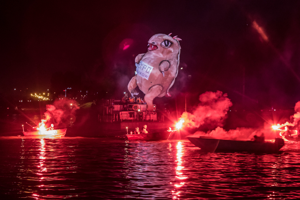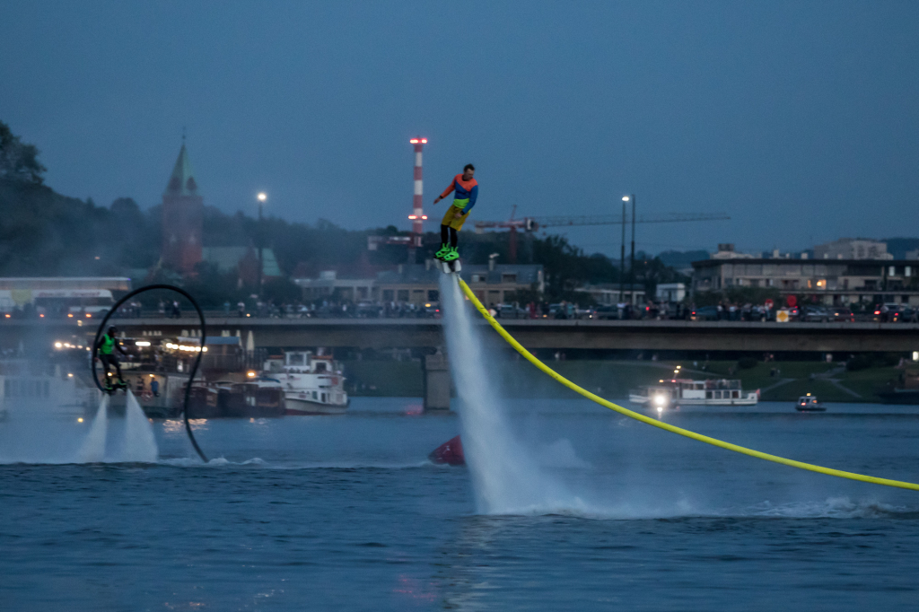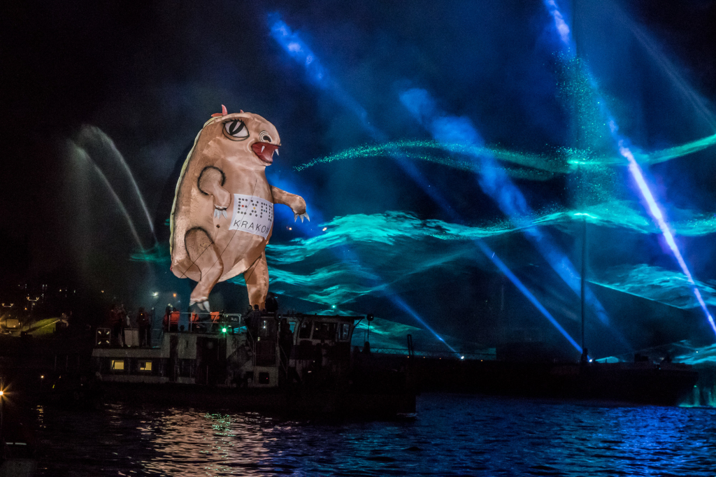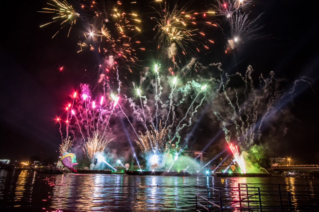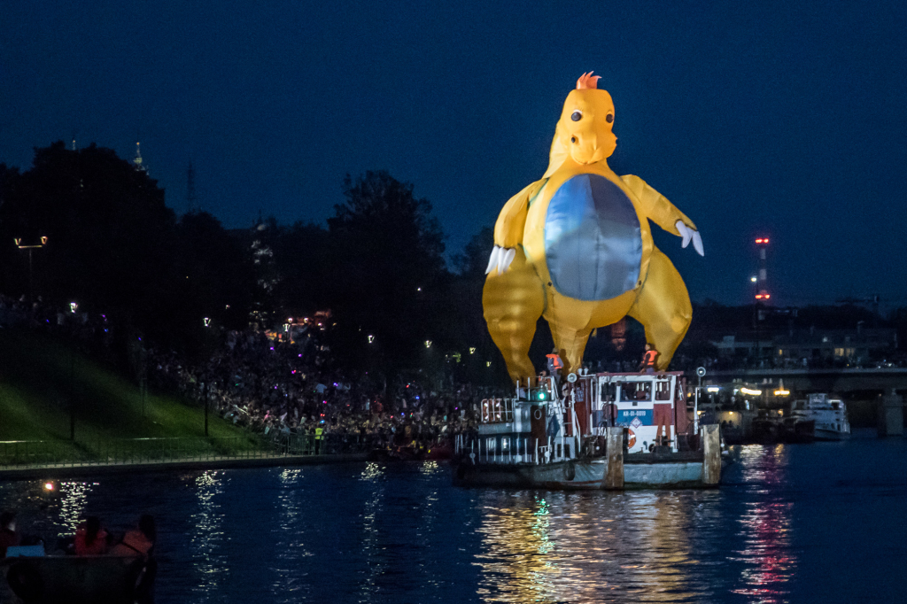 W sobotę o godz. 22 przy Zakolu Wisły pod Wawelem odbyło się niezapomniane widowisko z wykorzystaniem efektów pirotechnicznych, zaskakującej oprawy świetlnej i laserowej oraz gigantycznych kurtyn wodnych, a także pięknej muzyki. Największą atrakcją były ogromne latające smoki, animowane na barkach i statkach przez aktorów Teatru Groteska. Z głośników popłynęła muzyka m.in. Maurice’a Ravela, Gorana Bregovica czy Hansa Zimmera. Podniebną prezentację smoków poprzedził pokaz lotniarzy oraz flyboard na Wiśle.