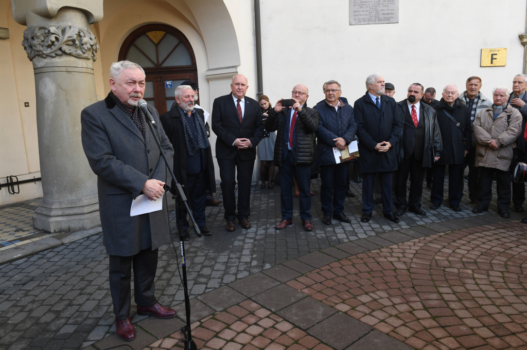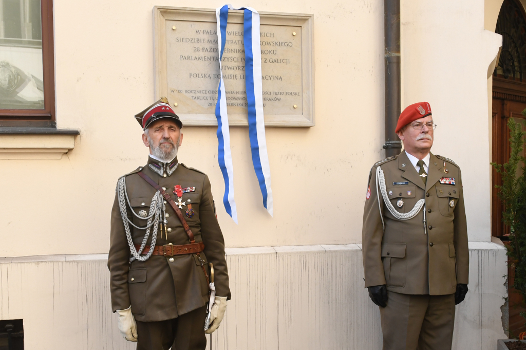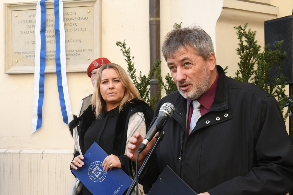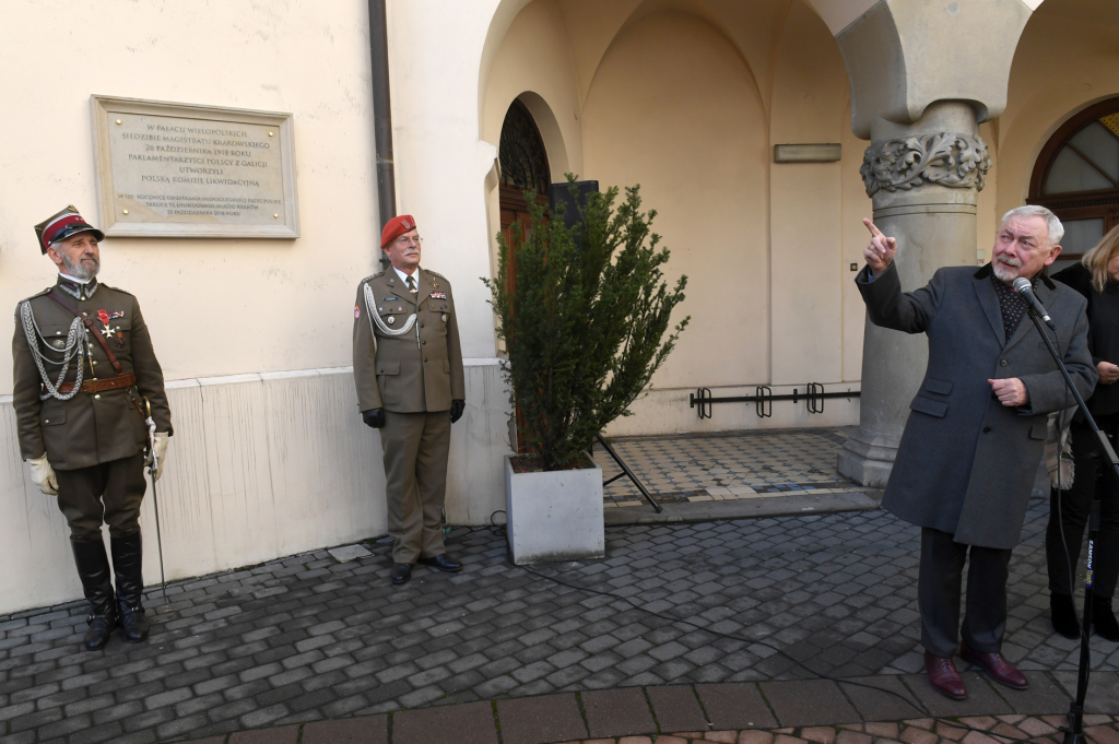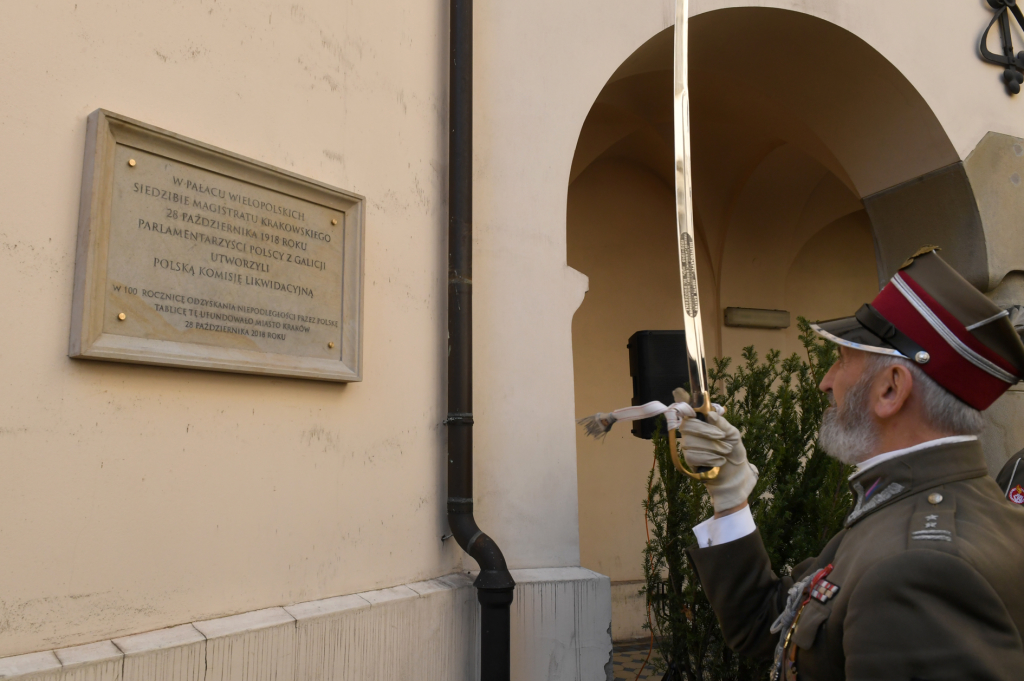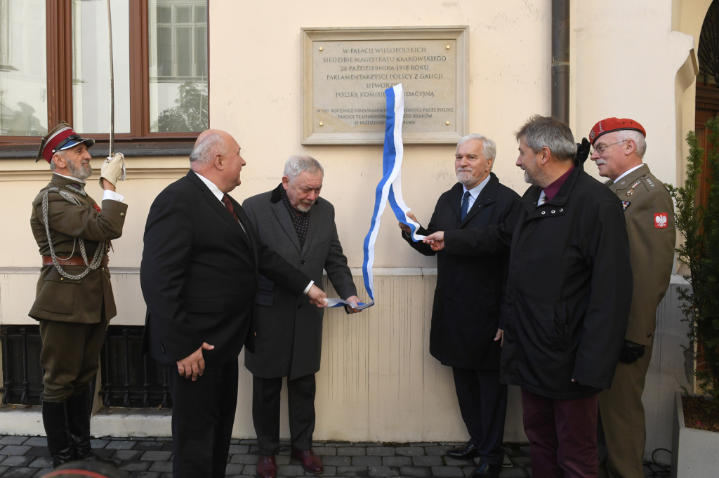 – Odsłaniamy tablicę poświęconą powołaniu w Krakowie Polskiej Komisji Likwidacyjnej. Prawie równo 100 lat temu, bo 28 października, zebrali się w tym gmachu posłowie i podjęli decyzję o powołaniu organu, który miał za zadanie zlikwidowanie władzy zaborczej. Ustalili, że od tej pory ziemie zaboru austriackiego należą do państwa polskiego. Na stolicę odradzającego się państwa wybrano Kraków. Na czele Komisji stanął Wincenty Witos i znani politycy – Ignacy Daszyński, Włodzimierz Tetmajer – powiedział prezydent Krakowa Jacek Majchrowski.
