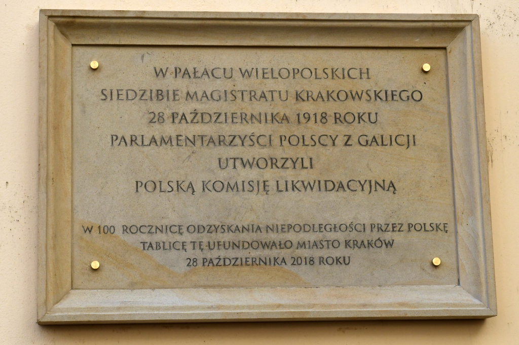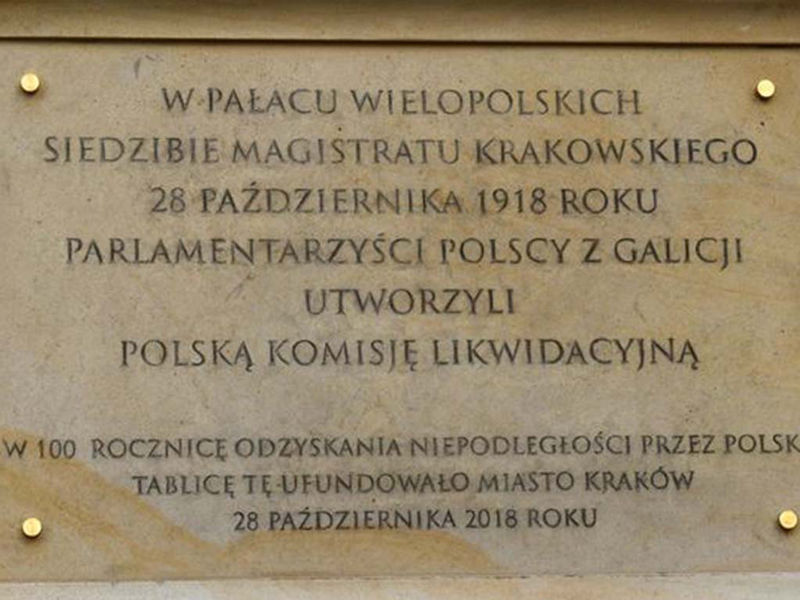 W poniedziałek, 29 października, na dziedzińcu pałacu Wielopolskich przy pl. Wszystkich Świętych, została odsłonięta tablica upamiętniająca powołanie w Krakowie Polskiej Komisji Likwidacyjnej. Tablicę odsłonił prezydent Krakowa Jacek Majchrowski. Odsłonięcie tablicy to wydarzenie towarzyszące konferencji popularnonaukowej „Krakowscy ojcowie polskiej niepodległości”, która odbywa się w dniach 29–30 października. Uroczystość wpisuje się w projekt „Wyzwolona” realizowany z okazji obchodów 100-lecia odzyskania przez Polskę niepodległości.