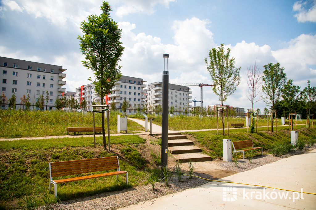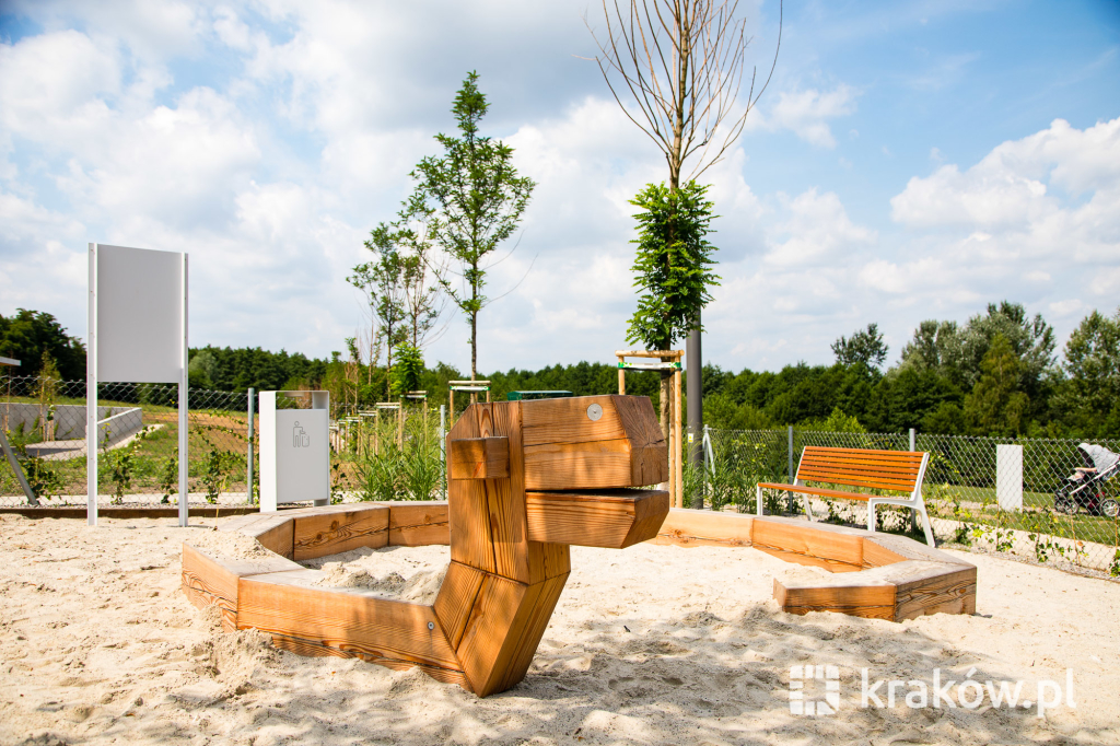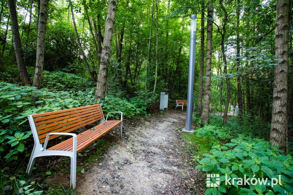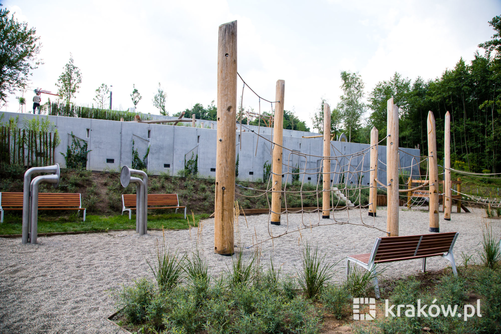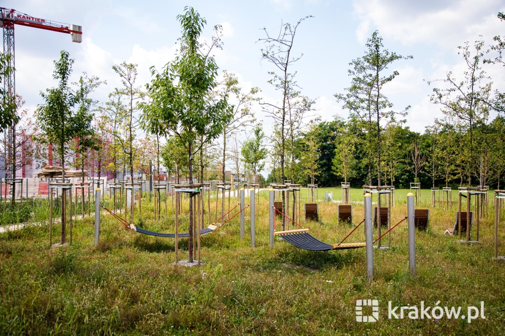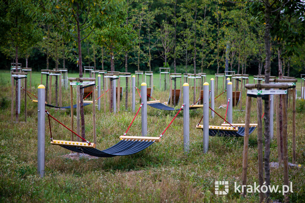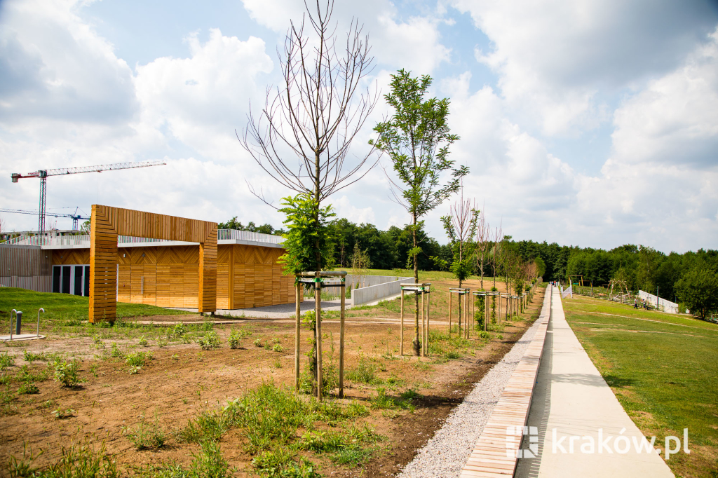 Znajduje się też wielofunkcyjny, 200-metrowy pawilon, który pełnił będzie funkcję kawiarni oraz miejsca spotkań mieszkańców. Na dachu pawilonu znajduje się taras, z którego można obserwować park. W parku zamontowanych zostało około 100 ławek, 135 koszy na śmieci, 20 hamaków, 20 leżaków oraz poidełko. W części leśnej parku powstała ścieżka spacerowa pomiędzy drzewami, przeznaczona dla biegaczy.